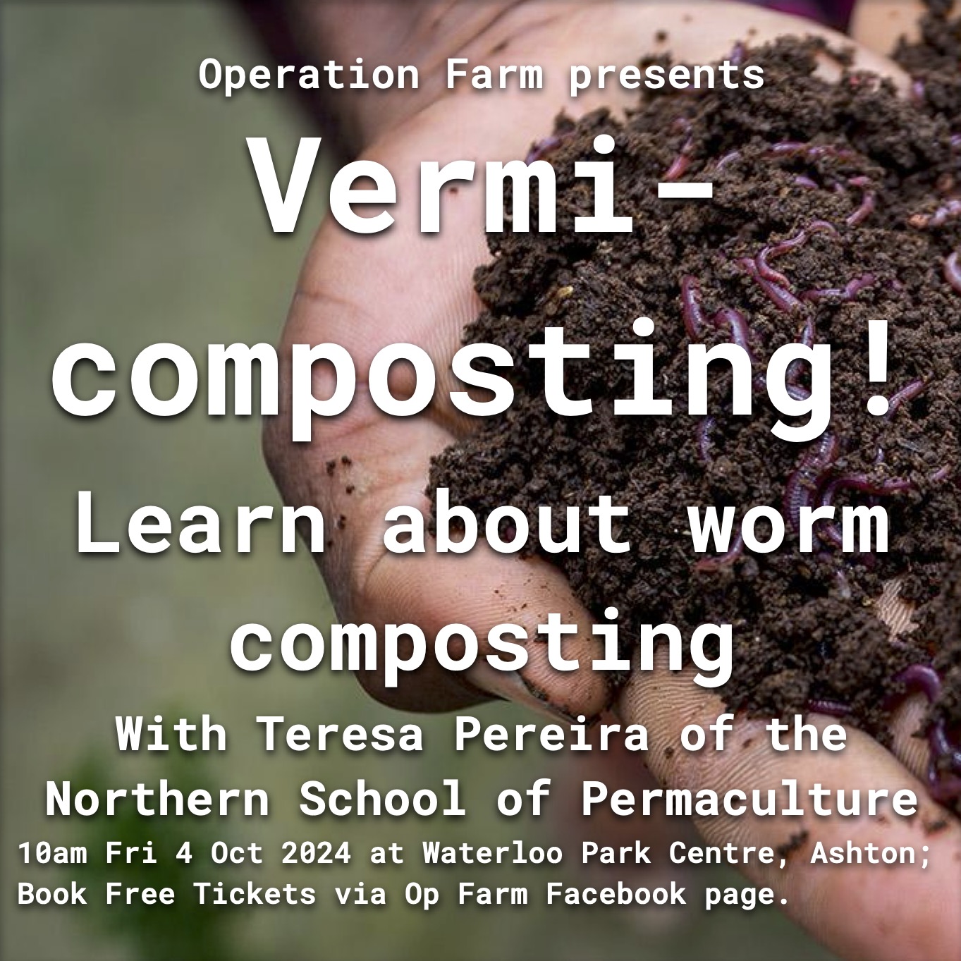 This is a free session but due to limited places, pre-booking is essential: https://www.eventbrite.co.uk/e/vermicomposting-tickets-1014686844667